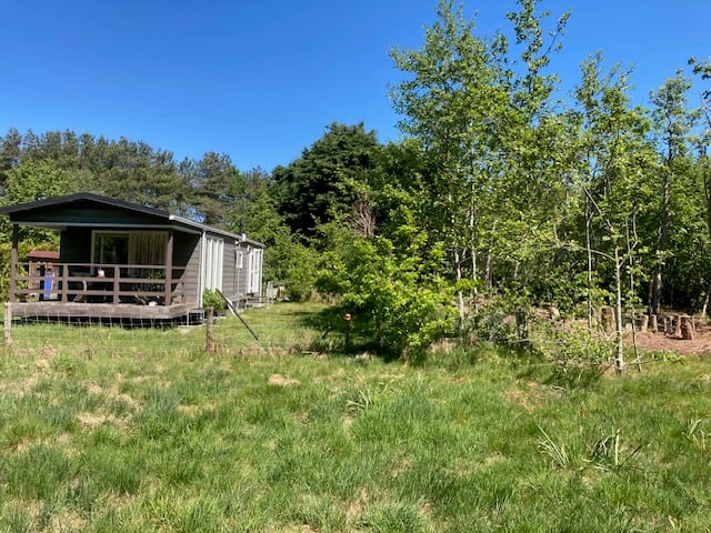 RUST EN RUIMTE. Modern, behaaglijk, gezellig, licht chalet met overdekte verlichte veranda op een unieke locatie met ruime tuin voor twee personen. Het natuurhuisje is van alle gemakken voorzien en zeer geschrikt voor verblijf in herfst en winter. Verwarming d.m.v. CV. Opgemaakte bedden, handdoeken en keukenbenodigdheden inclusief. Een bank en relaxstoel bieden comfort na een heerlijke dag buiten zijn of op een regenachtige luie dag. De slaapkamer heeft een stabiel bed (160 x 200), matras met topper. De ramen zijn voorzien van horren en verduistering. In overleg is een tweede kamer te boeken. Op het verhoogde terras met overkapping staan twee comfortabele stoelen met leuning en een tafeltje. Voor In de tuin zijn er eettafel met stoelen, ligstoel en hangmat en houten lounge-set . Een vaatwasser, stofzuiger, TV, Nespresso/filterkoffie apparaat, Airfryer, broodrooster, waterkoker en BQ, staan tot uw beschikking. Internet en Digitenne van KPN.